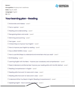 Turn insight into action. Employers and educators achieve better outcomes when they clearly understand an individual’s skills and where gaps exist. That’s why every assessment generates an AI-enhanced Results Report providing a clear, practical guide to strengths and development needs.