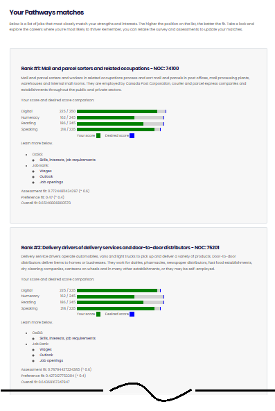 2. Interest Match: A brief survey captures the individual’s preferences related to work environments, tasks, and general interests. These include things like working with people, data, or tools; preferences for structure or flexibility; and interest in hands-on vs. analytical tasks. The responses are then compared to occupational data from the Government of Canada’s OaSIS system, which outlines the typical interest and workstyle attributes associated with each of 298 occupations. Occupations that more closely reflect an individual’s preferences receive higher interest match scores.
